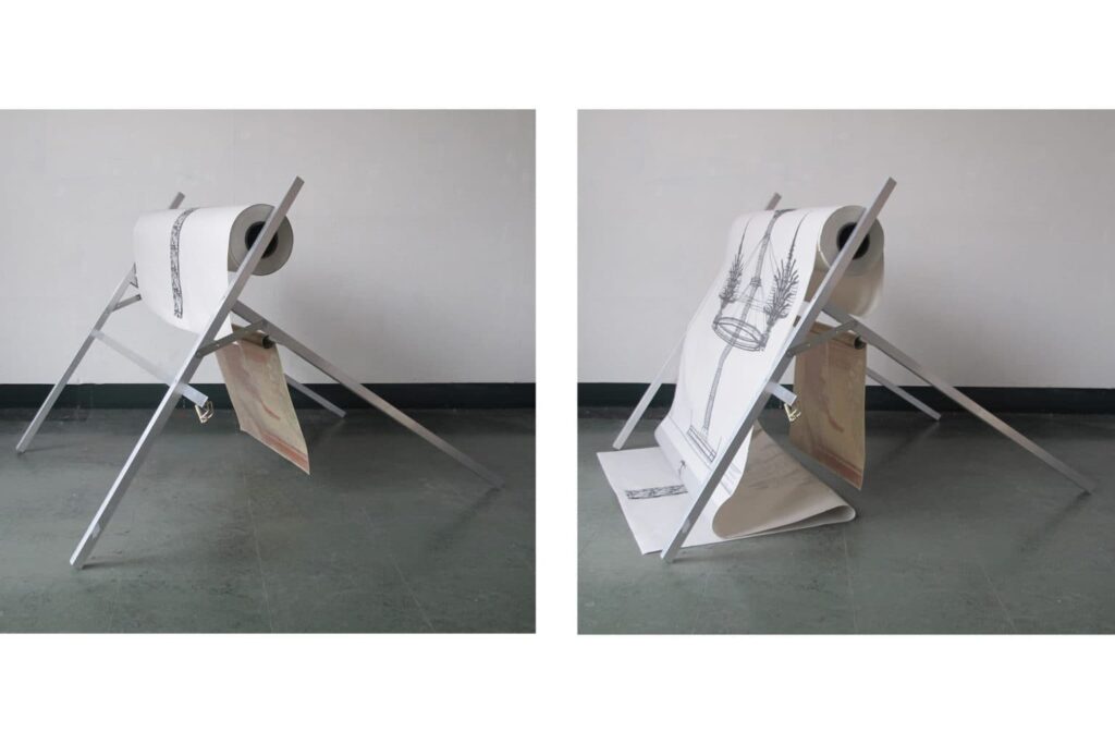 Productiva y el proyecto inicial se transformó en lo material y en lo conceptual. Mi trabajo parte desde lo escultórico, entendido en un sentido amplio, y usualmente parte desde la experimentación material en el taller junto con observaciones espaciales y contextuales. Uno de mis objetivos era poner a prueba nuevos medios y formas de producción. Esto implicó desplazar mis métodos habituales y trabajar con impresión de gran formato, archivo digital, escaneo y modelado 3D. Fue la primera vez que integré estos procesos en mi producción de manera autónoma.